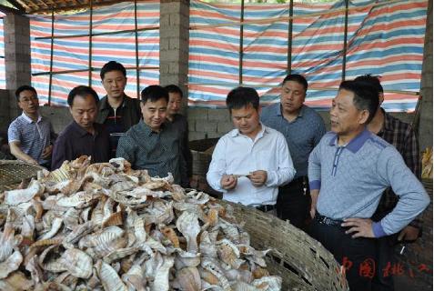 图为市林业局局长肖正军(前排右二)一行查看马迹塘鸬鹚湾基地玉兰片烘烤现场